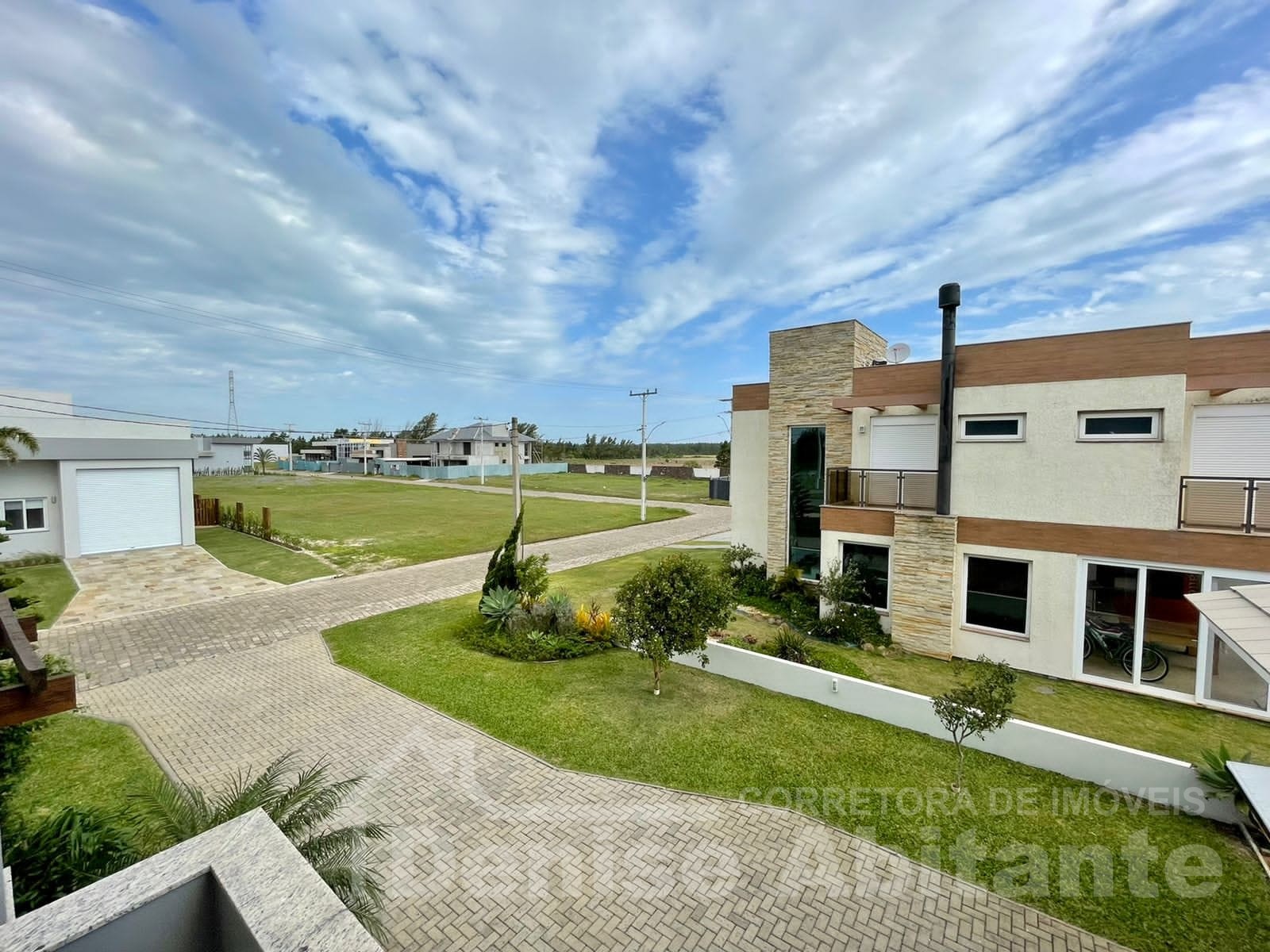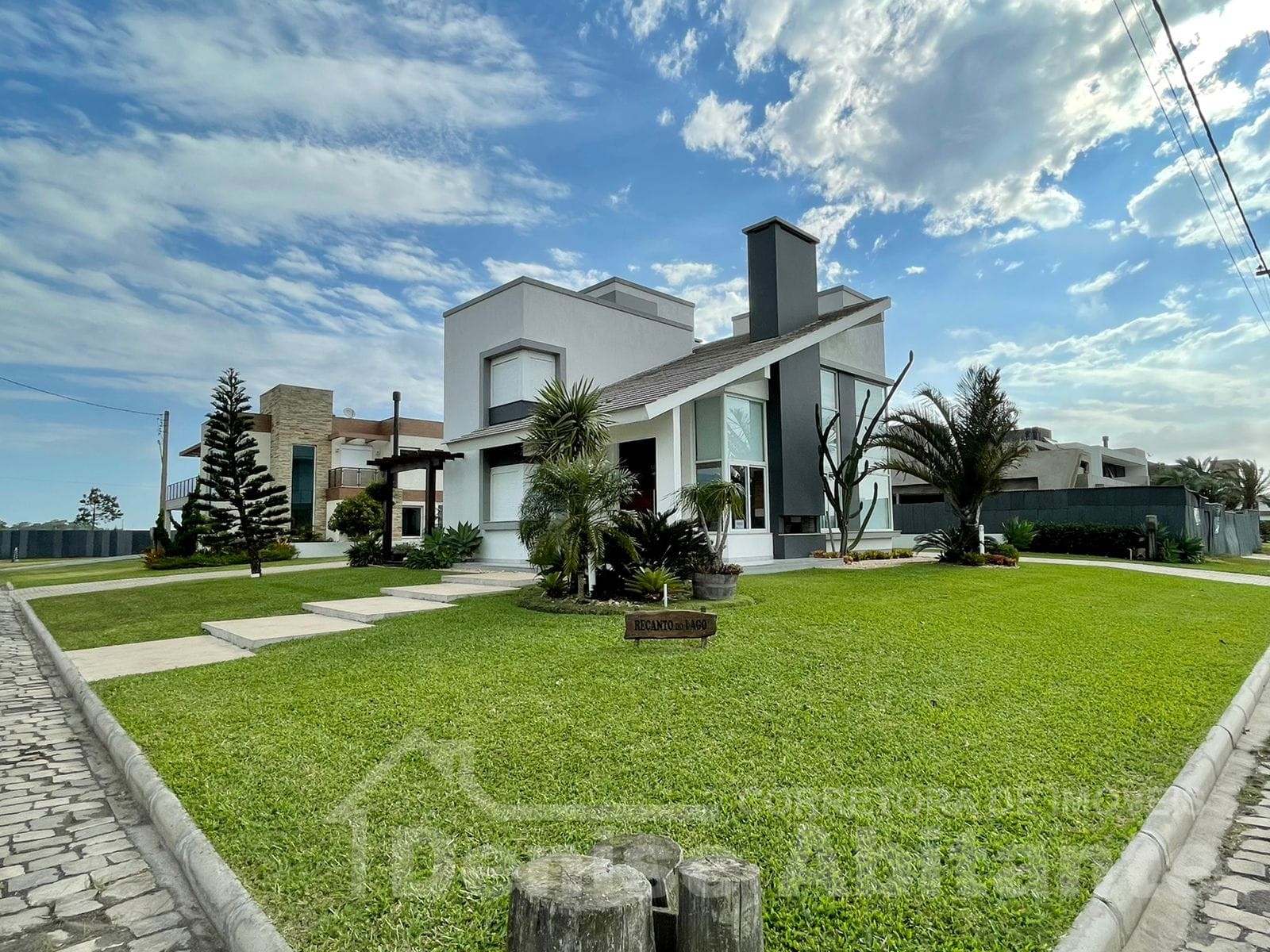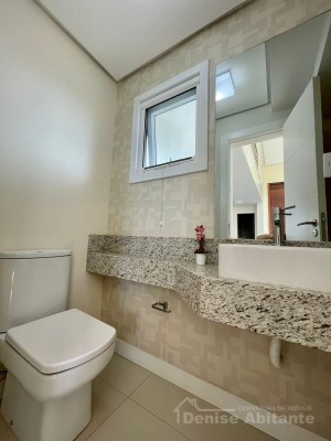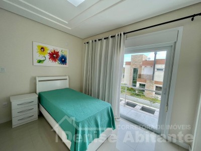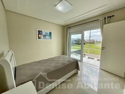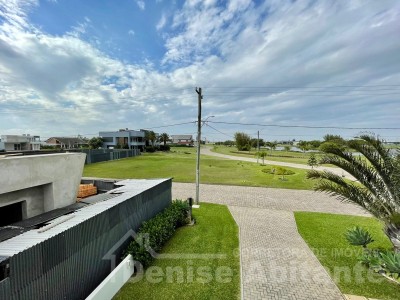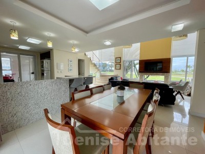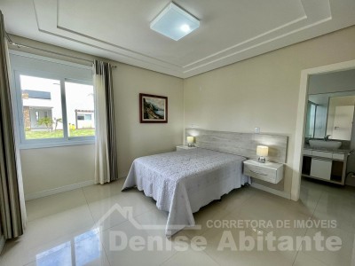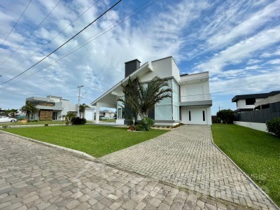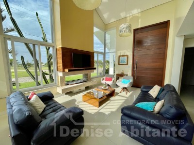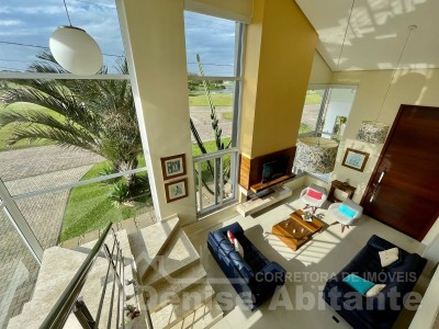 Excelente Sobrado Novo de esquina no Condomínio Lagoa do Passo na praia de Xangri-lá/RS, Mobiliado e Decorado, composto por 4 suítes, sendo 1 suíte no térreo, total 4 banheiros + lavabo, living com pé direito alto e envidraçado com lareira, cozinha integrada ao living e com churrasqueira, pátio, terreno de esquina, garagem para 2 carros. Construção em alvenaria com laje, esquadrias em PVC, piso porcelanato. Toda infraestrutura de um excelente condomínio.