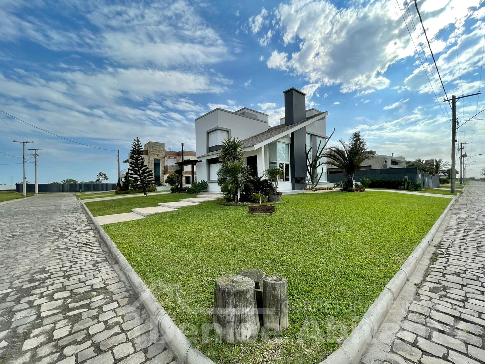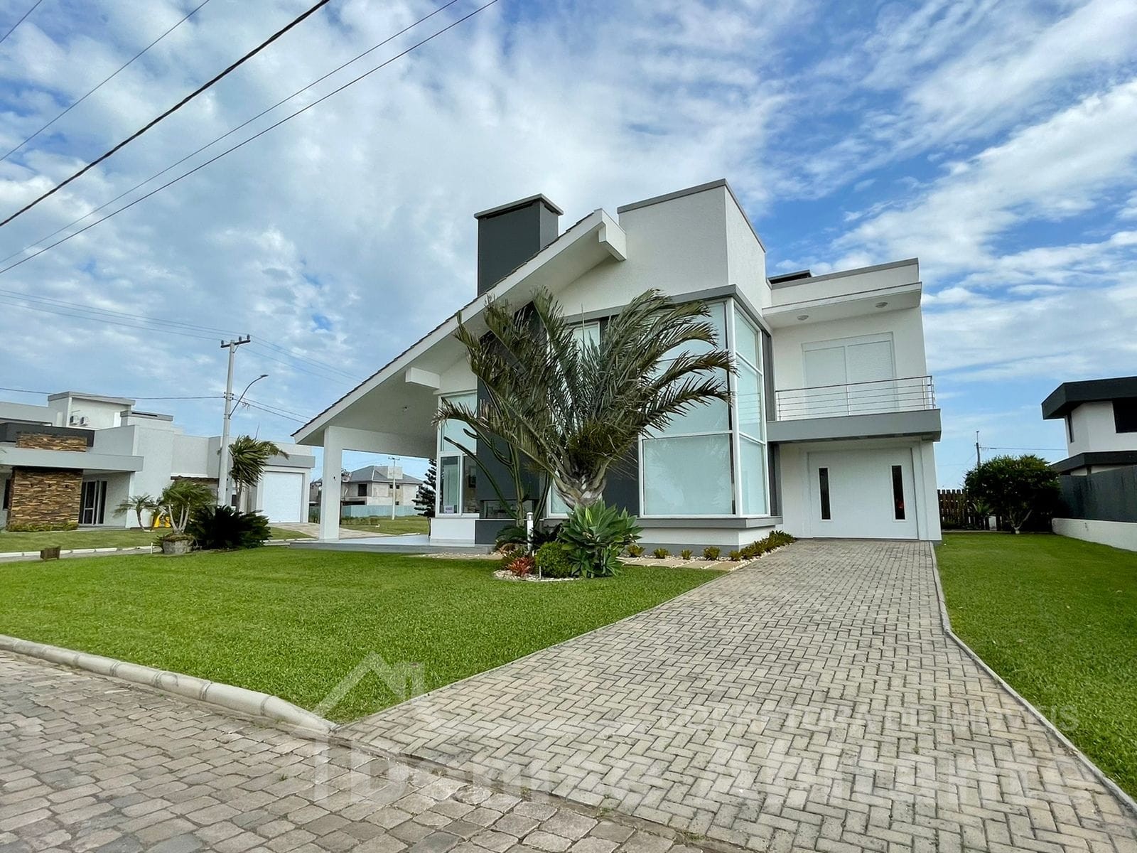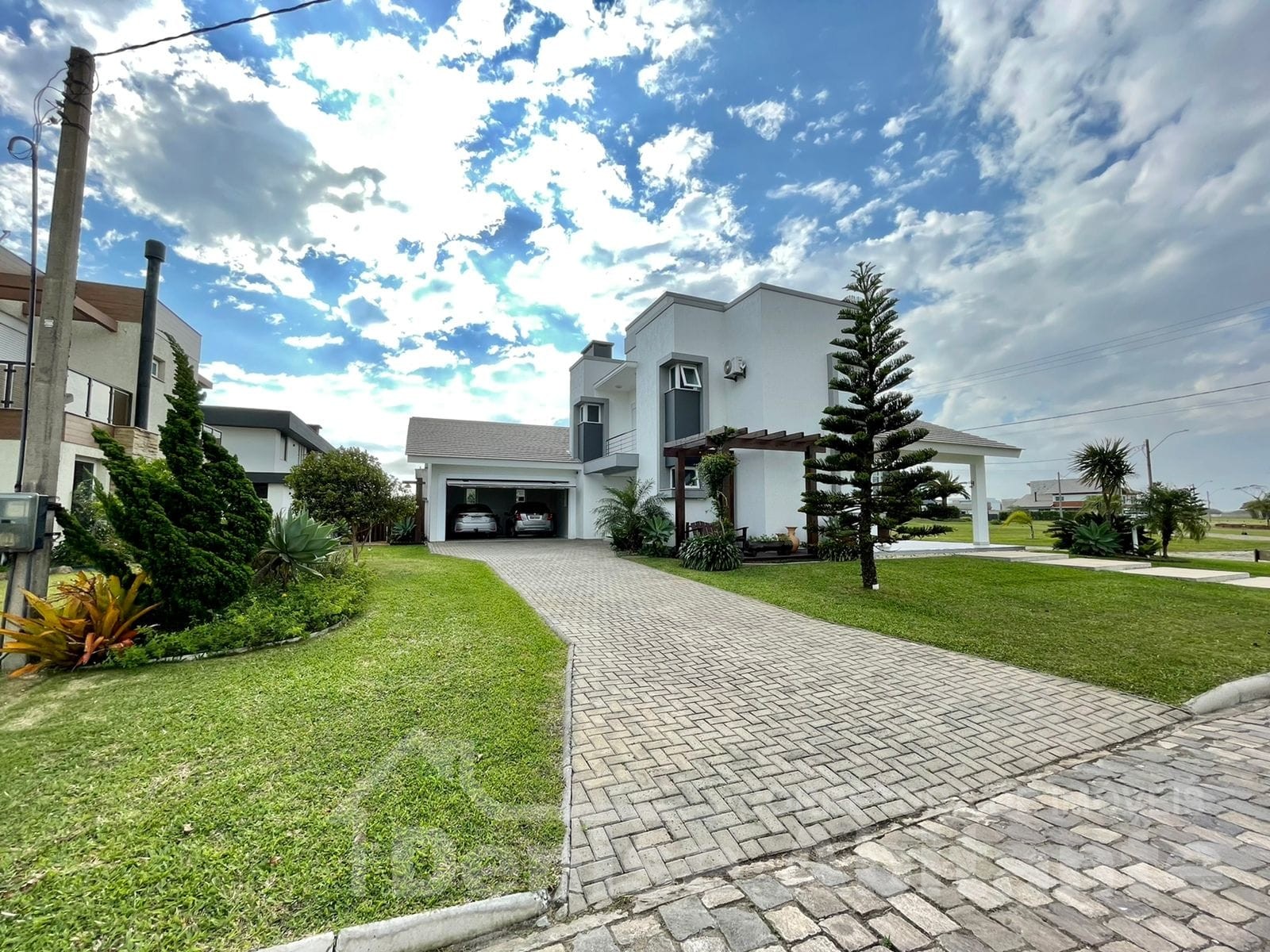Excelente Sobrado Novo de esquina no Condomínio Lagoa do Passo na praia de Xangri-lá/RS, Mobiliado e Decorado, composto por 4 suítes, sendo 1 suíte no térreo, total 4 banheiros + lavabo, living com pé direito alto e envidraçado com lareira, cozinha integrada ao living e com churrasqueira, pátio, terreno de esquina, garagem para 2 carros. Construção em alvenaria com laje, esquadrias em PVC, piso porcelanato. Toda infraestrutura de um excelente condomínio.