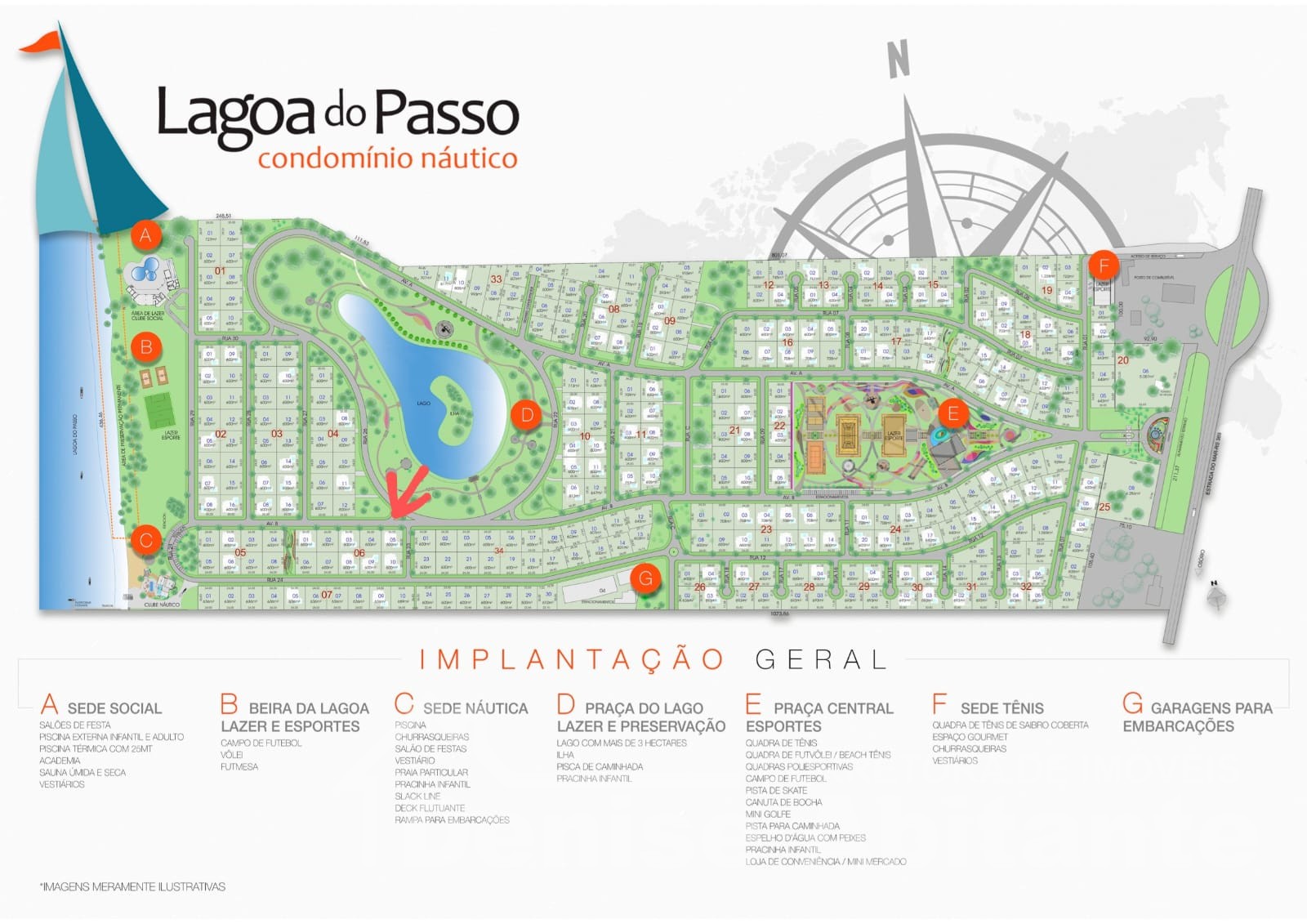 - Sede Náutica com área completa com deck - rampa de acesso - Trapiche Flutuante - Piscina Interna e Externa - Churrasqueiras e vestiários - Quadras Poliesportivas - Quadras de Tênis - Campo de Futebol - Pista de Skate - Cancha de Bocha - Minigolfe - Garagens para Embarcações - Infraestrutura para guardar equipamentos Lanchas e Jet Skys - Lagos e Pistas de Caminhadas